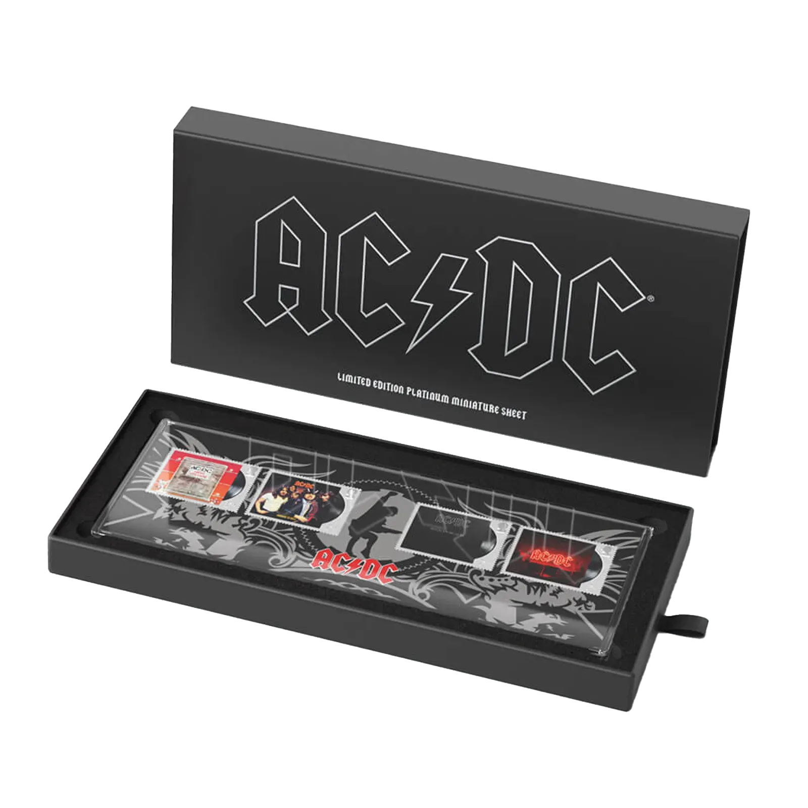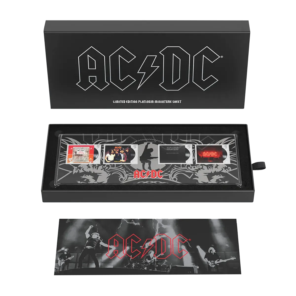 A unique, limited edition tribute to four AC/DC platinum-certified albums. A stunning replica of Royal Mail’s AC/DC Miniature Sheet produced in platinum.
