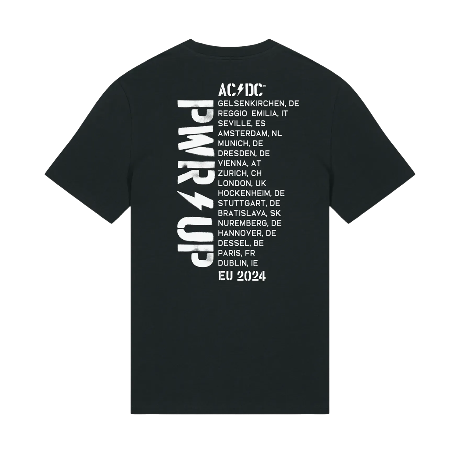 Gear up with this exclusive PWR UP Black & White T-shirt from the EU 2024 Tour collection, showcasing all tour destinations on the back.