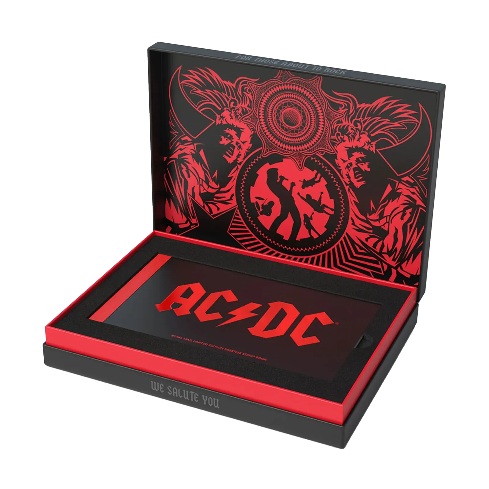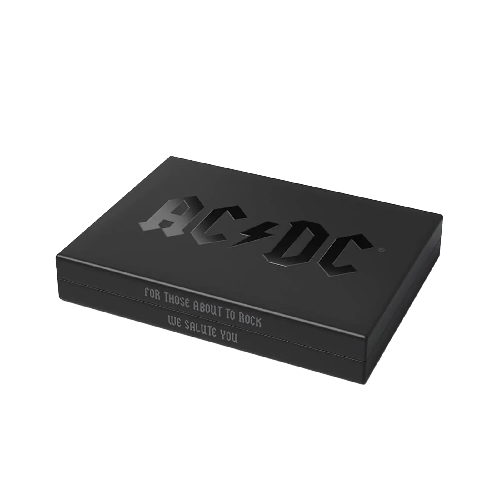 The sleek all-black presentation case features UV-printed detailing with the band’s iconic logo and the phrase they made famous “For those about to rock we salute you”