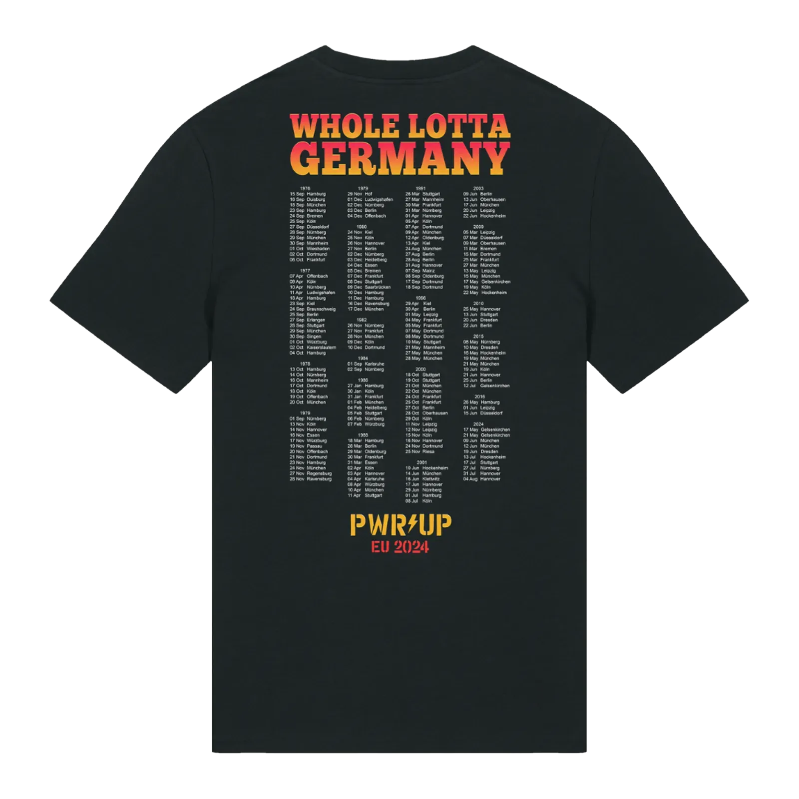 Gear up with this exclusive PWR UP Whole Lotta Rosie Germany T-shirt from the EU 2024 Tour collection, showcasing every show AC/DC has played in Germany since 1976.