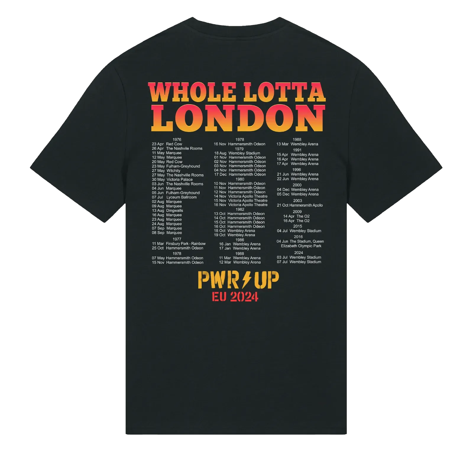 Gear up with this exclusive PWR UP Whole Lotta Rosie Germany T-shirt from the EU 2024 Tour collection, showcasing every show AC/DC has played in London since 1976.