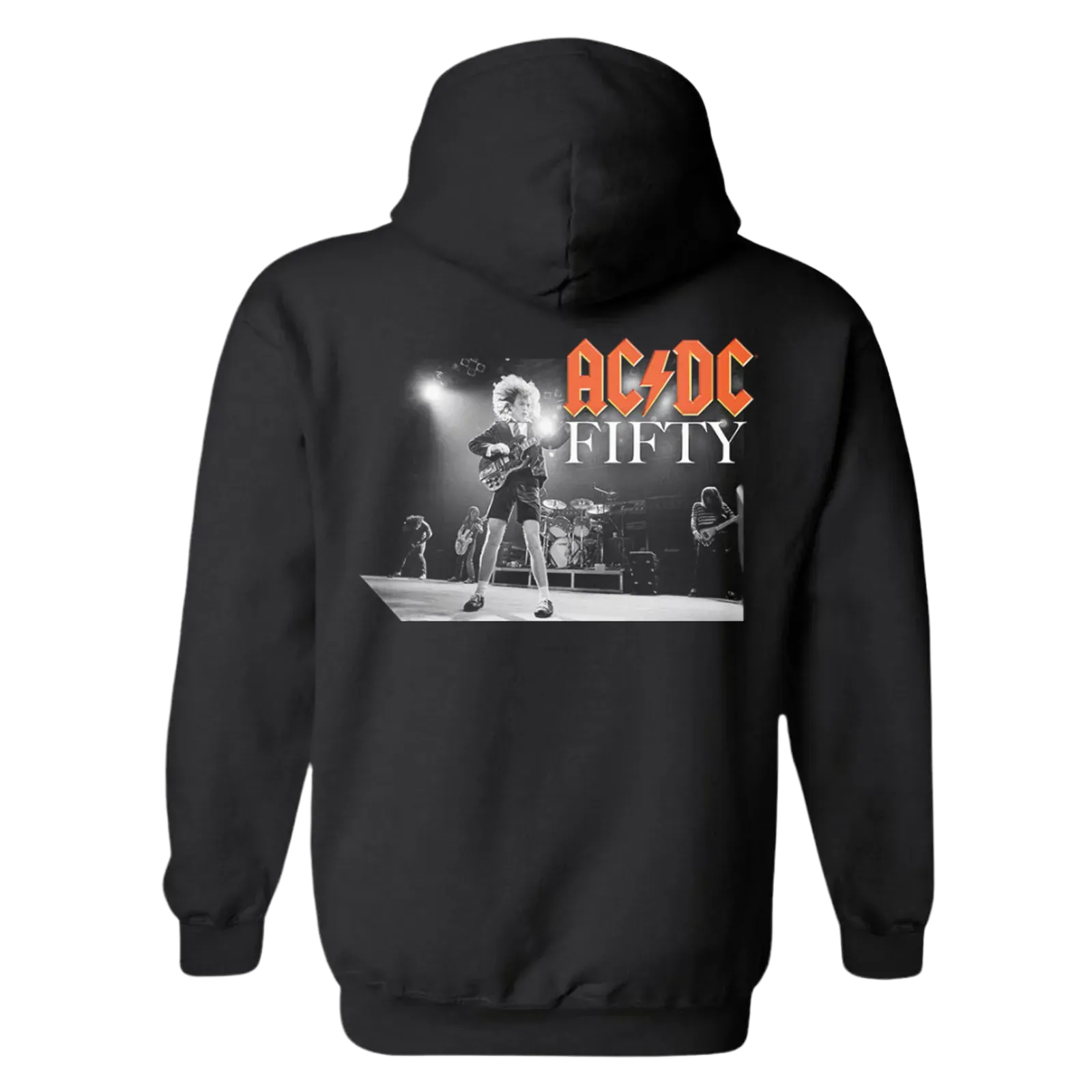 Celebrating 50 years of AC/DC. This anniversary hoodie features a vintage photo of Angus Young preforming on stage and the classic AC/DC logo.