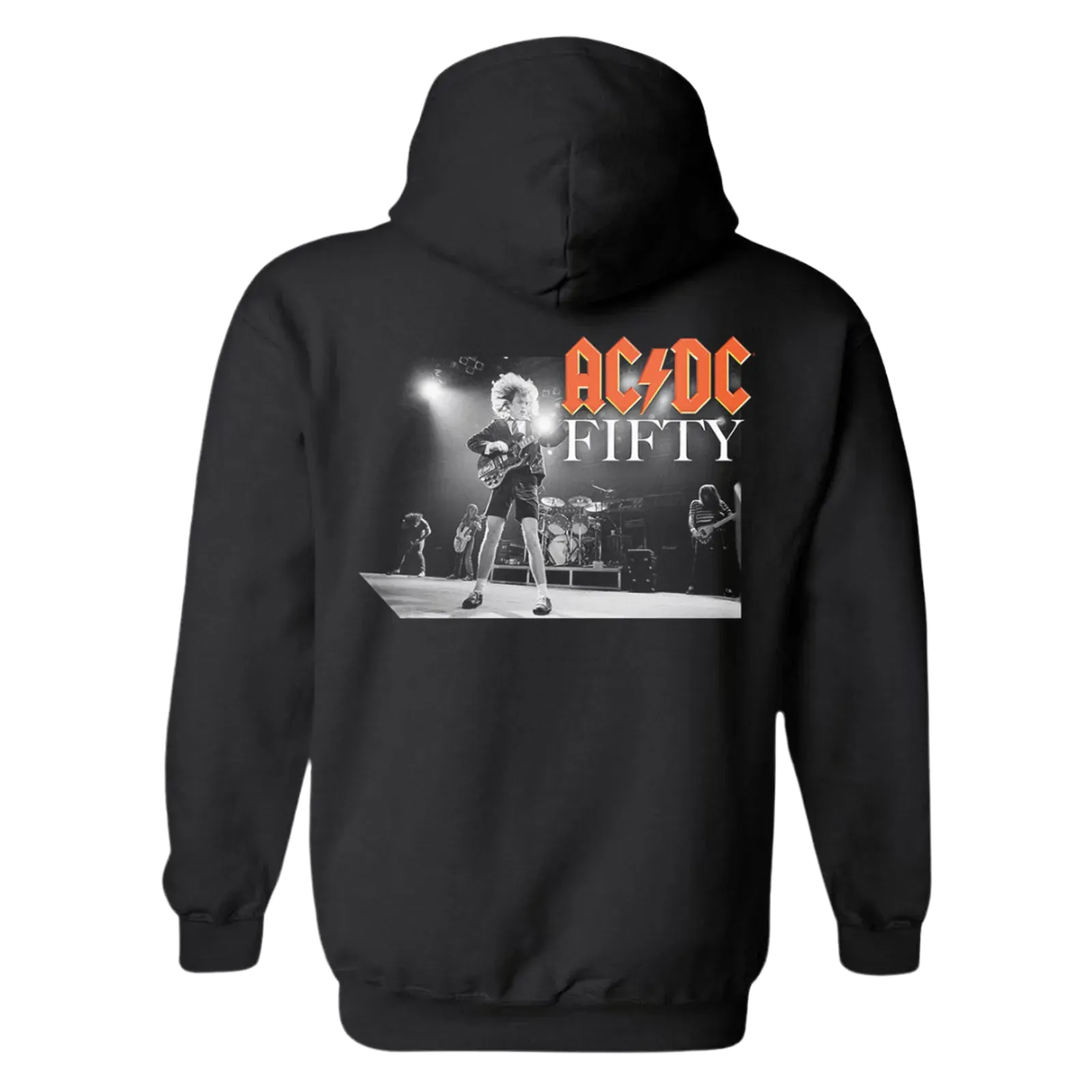Celebrating 50 years of AC/DC. This anniversary hoodie features a vintage photo of Angus Young preforming on stage and the classic AC/DC logo.