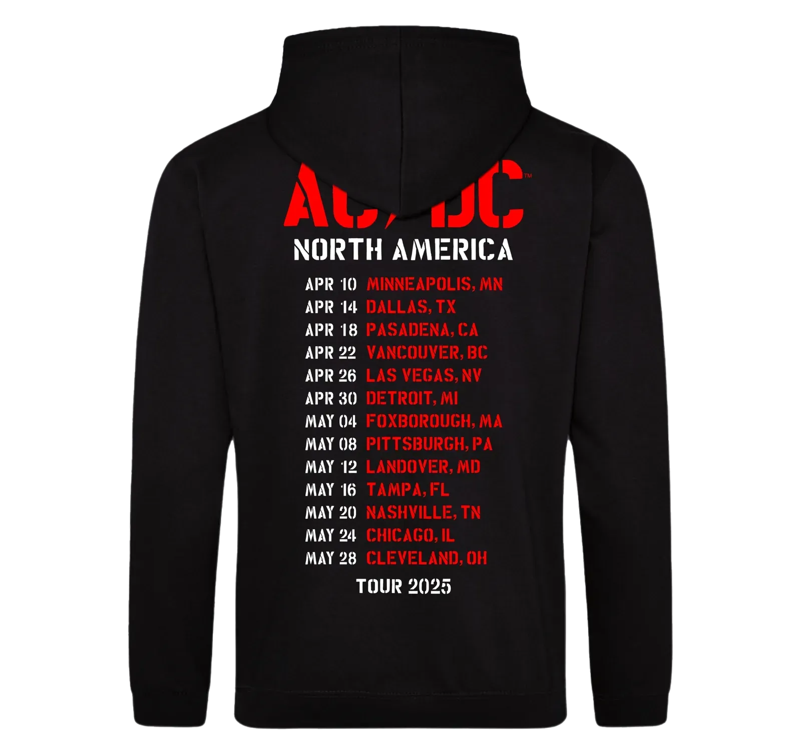 Gear up with this exclusive AC/DC Angus PWR UP Tour Zip Hoodie from the North America 2025 Tour collection, featuring all tour dates, cities, and stadiums on the back.