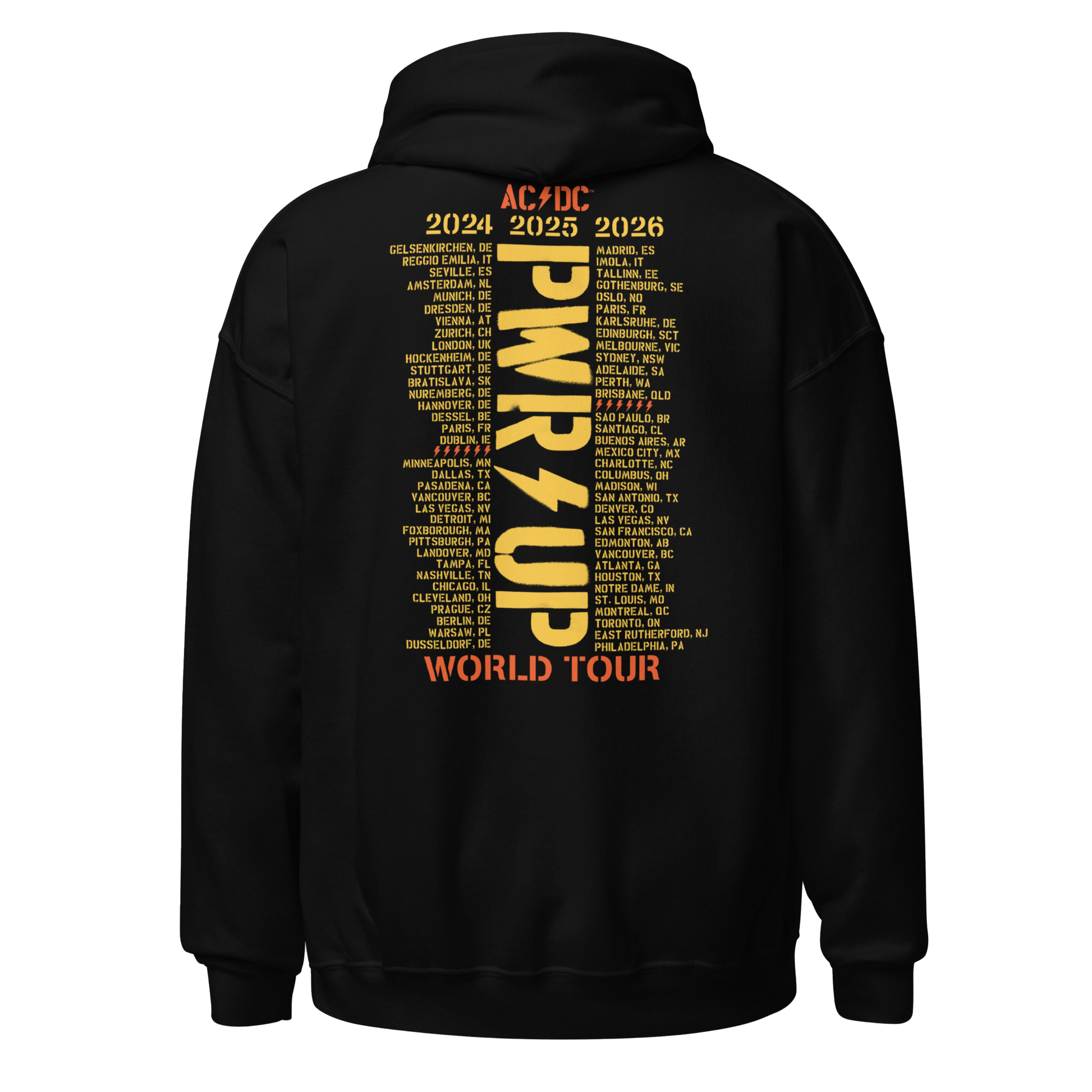 Gear up with this exclusive AC/DC PWR UP World Tour Hoodie from the 2026 Tour collection, featuring all tour cities from 2024-2026 on the back.