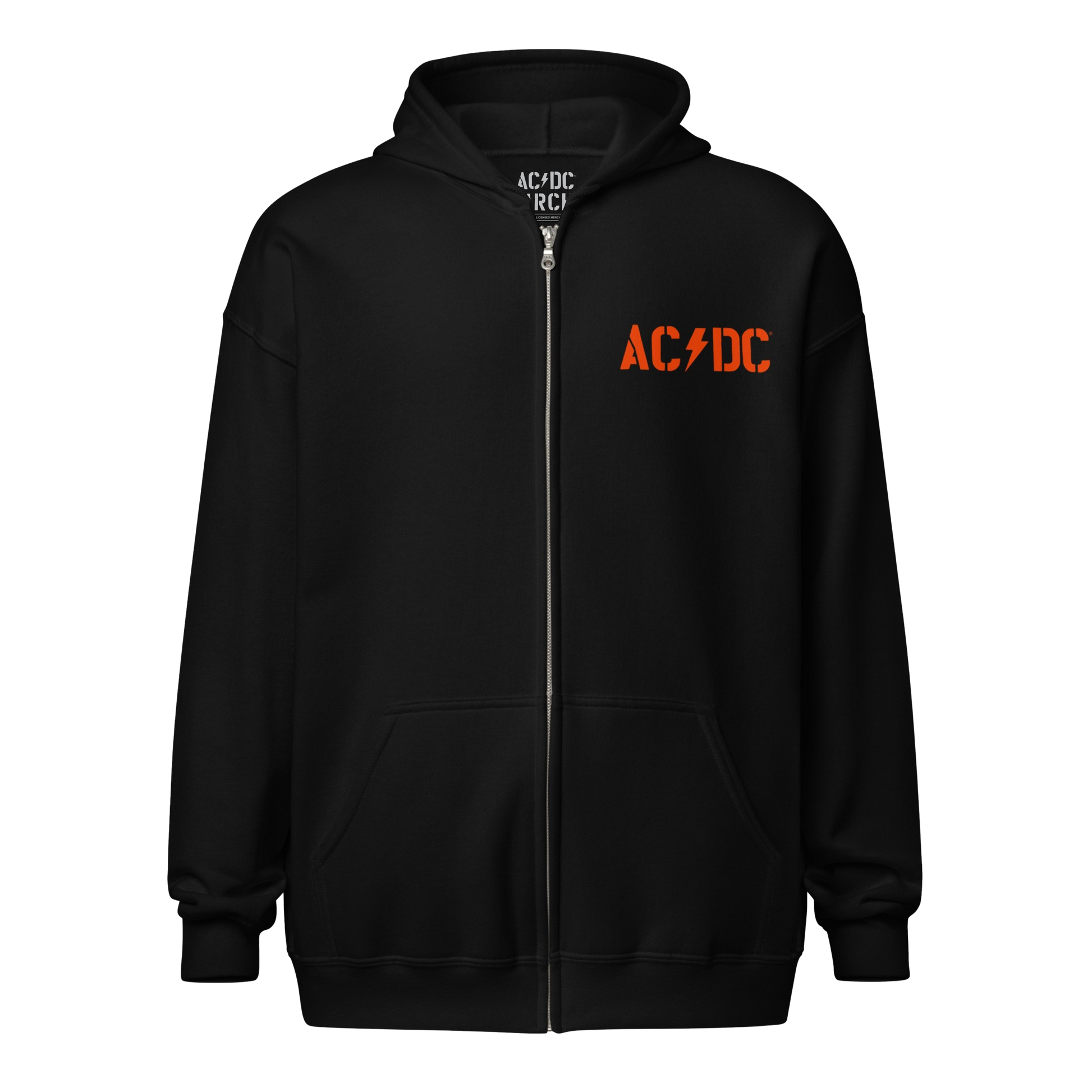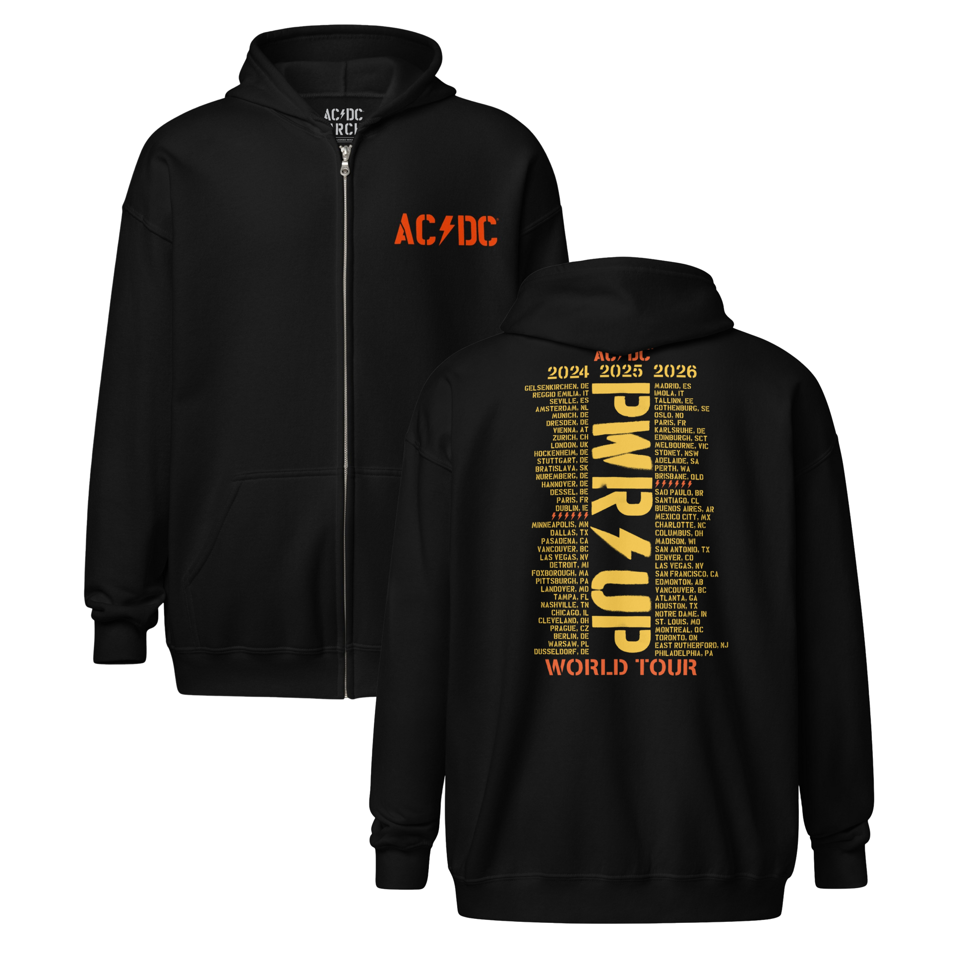 Gear up with this exclusive AC/DC PWR UP World Tour Zip Hoodie from the 2026 Tour collection, featuring all tour cities from 2024-2026 on the back.